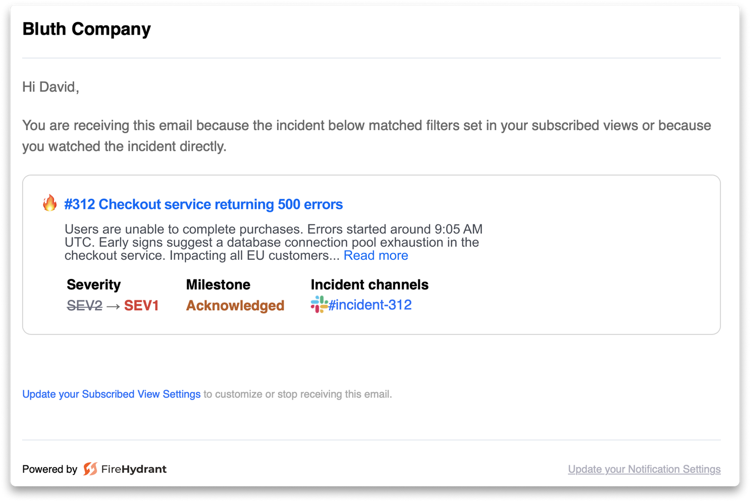 1. Real-time emails for milestone and severity changes: We’ve expanded what it means to watch an incident. Instead of just seeing your watched incidents on the dashboard, you’ll now receive real-time emails anytime a milestone or severity changes.