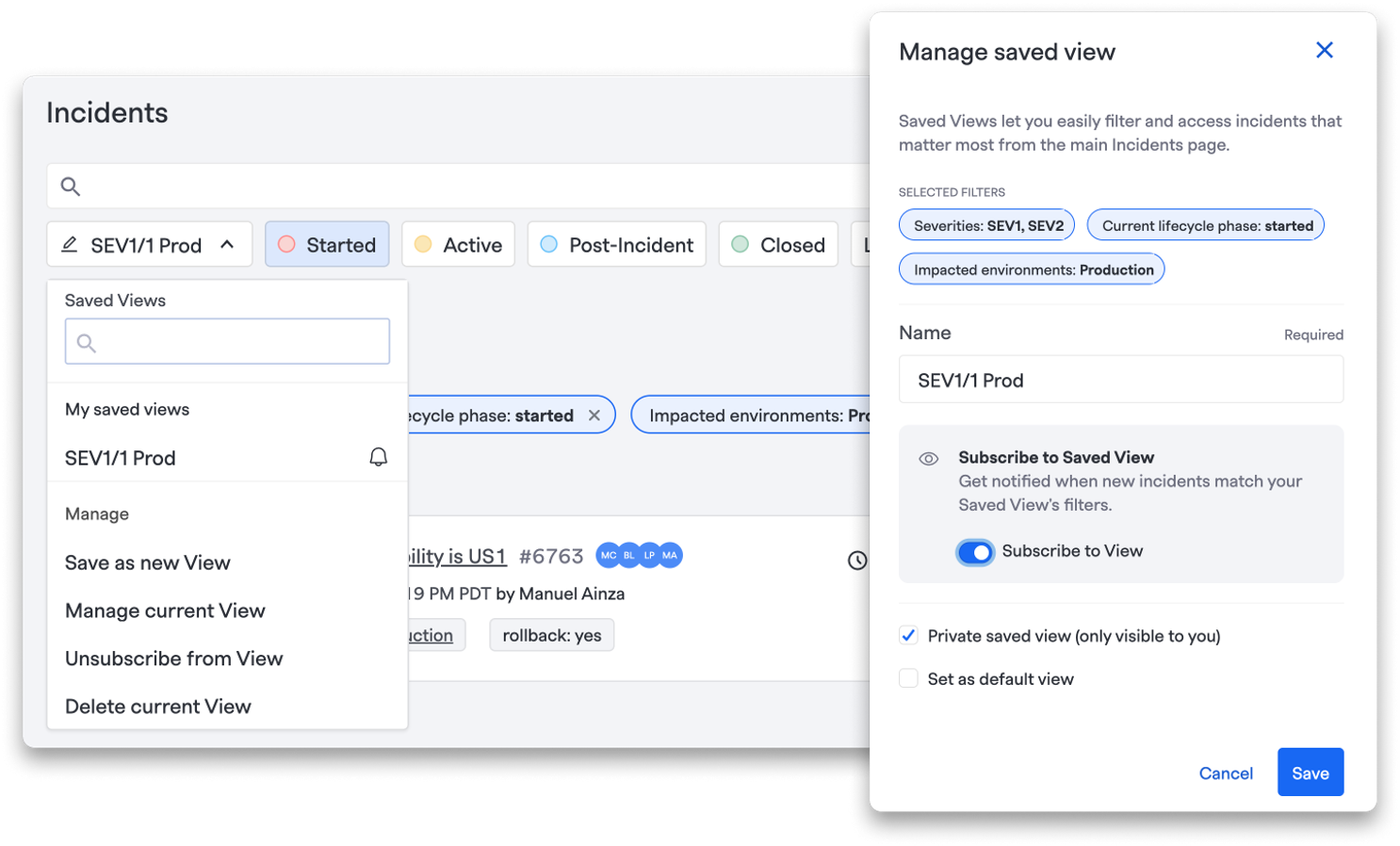 2. Auto-Watch via Saved Incident Views: You can now subscribe to Saved Incident Views — filtered sets of incidents based on what matters most to you: impacted services, impacted functionalities, service owning team, tags, and more. Once subscribed, you’ll automatically “watch” any matching incidents and get notified as they progress.