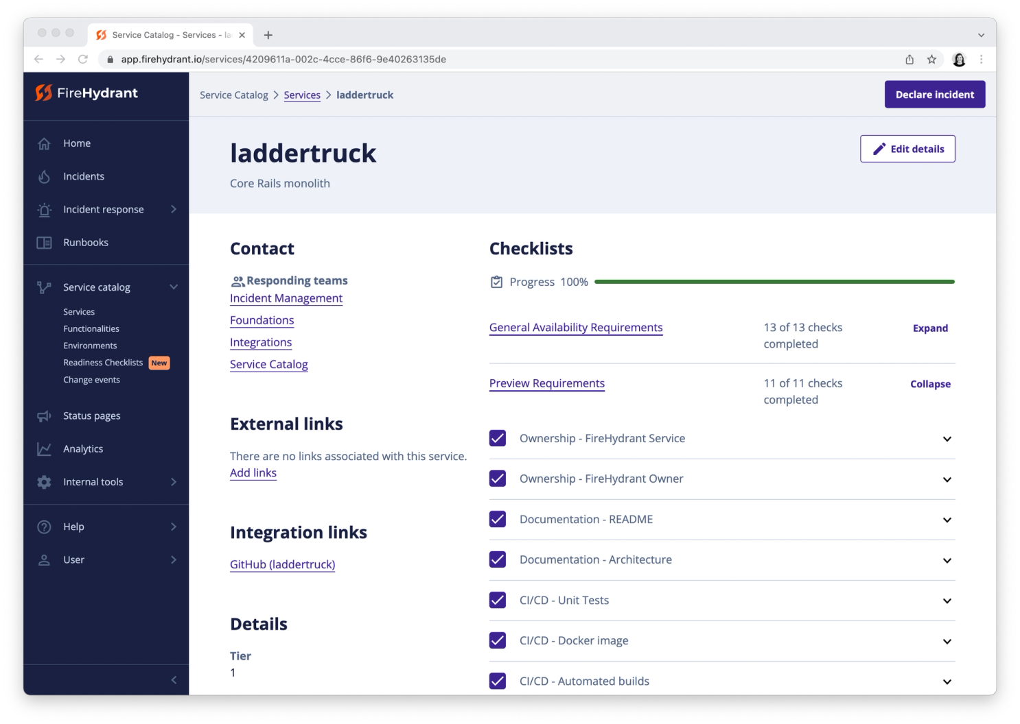 Responding to incidents quickly and reducing your mean time to recovery (MTTR) starts with making sure your software is ready for production. Ensure your services have operational best practices in place like team ownership, alerting, documentation, and defined service level objectives (SLOs). Keep your customers’ data secure with dedicated security checklists so every service meets your security requirements. This will level up the technical excellence of your system with checklists that help mitigate future incidents by having robust service standards.