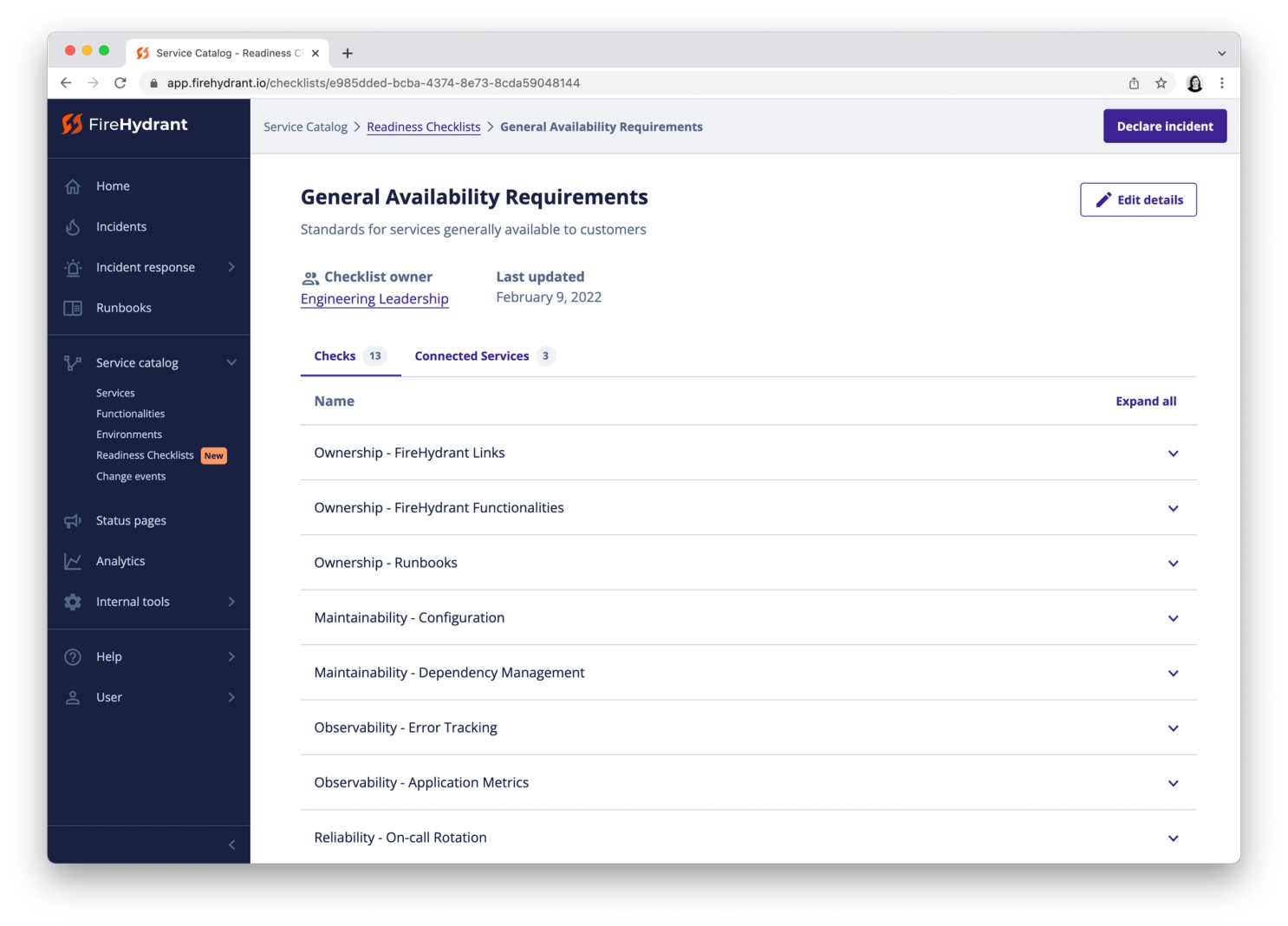 Maintaining the reliability of complex services just got easier with Operational Readiness Checklists. Service owners and engineering leaders can now evaluate and maintain the production readiness of the services their users rely on every day: spot risks in your service dependencies before they cause incidents, and respond quickly if they do. Before you put a new service into production, readiness checklists help you dot-your-is and cross-your-ts.