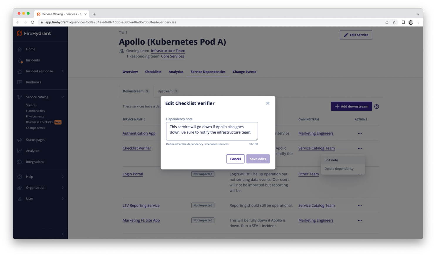 As your service catalog becomes more complex, so does the burden of defining your service relationships. After connecting dependencies, service owners can add extra value to this service definition with the use of dependency notes. These notes can provide crucial insight for determining if dependencies should be brought into the impacted scope of an active incident. Identifying important subtleties between services can help inform engineers on which areas to execute their next steps, improving their service downtime.