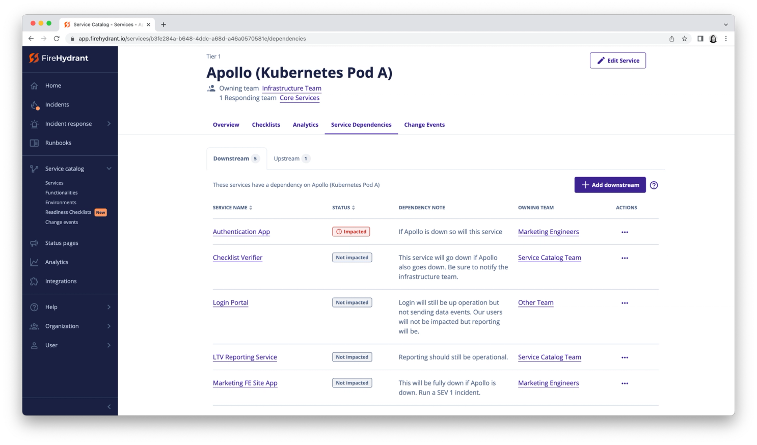 When an incident happens, most organizations have a way of identifying all affected services. The trouble is, it’s often a human-centered process that depends on the knowledge of key individuals or manually updated documentation. There might be a version in your alerting tool, a version in your corporate Wiki, and a different version still in your team’s head. This means that during incidents, responders spend valuable time determining the full impact that could be spent remediating core issues. With the addition of service dependencies to FireHydrant Service Catalog, responders can immediately identify the full scope of service and customer impact across an incident with a comprehensive view of downstream and upstream dependencies. And since Service Catalog documents service ownership, they can quickly pull in the needed responding teams.