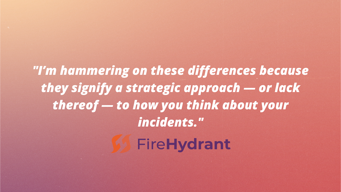 I’m hammering on these differences because they signify a strategic approach — or lack thereof — to how you think about your incidents. Both terms involve making decisions based on the information and resources you have at hand. But incident management works with a lot more data and time, which allows it to maintain the health of an entire system, rather than simply responding to emergencies.