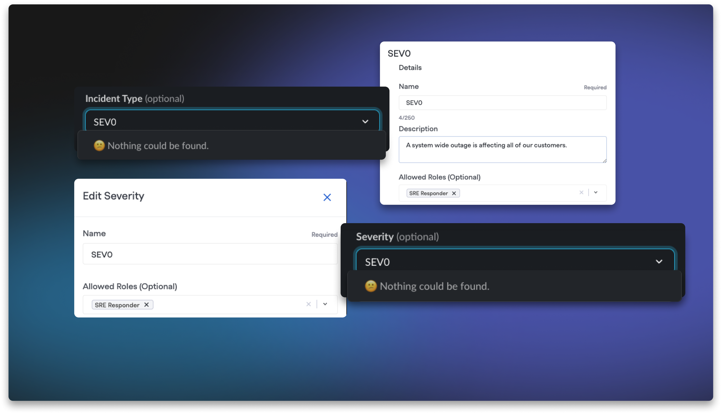 Restrict Severities by Role You can also restrict which severities users can declare when creating incidents. Prevent junior team members from accidentally declaring SEV1s, align severity selection with your organizational escalation policies, and maintain consistency across teams with different responsibilities.