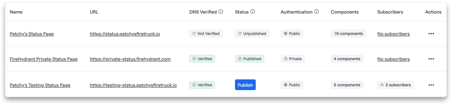 You can now view the status of all your existing status pages directly from the overview table. See which pages have verified DNS entries, are authenticated, and which are ready for publishing.