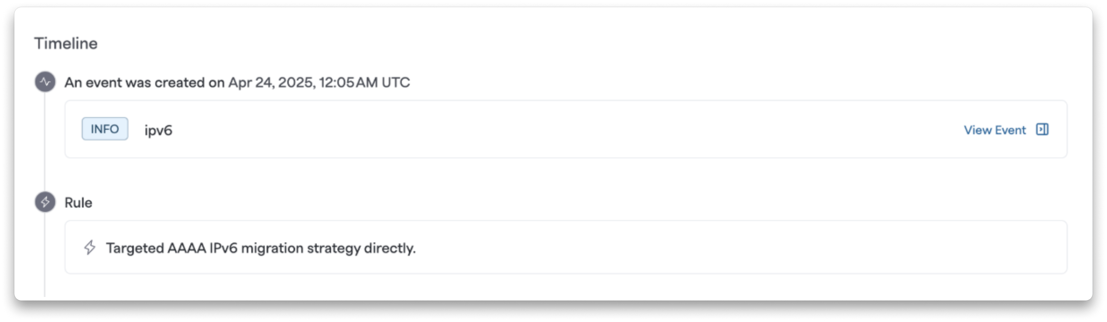 We've improved the Alert Timeline UI to clearly indicate when an alert was created by direct targeting versus being caught by a rule, making it easier to: