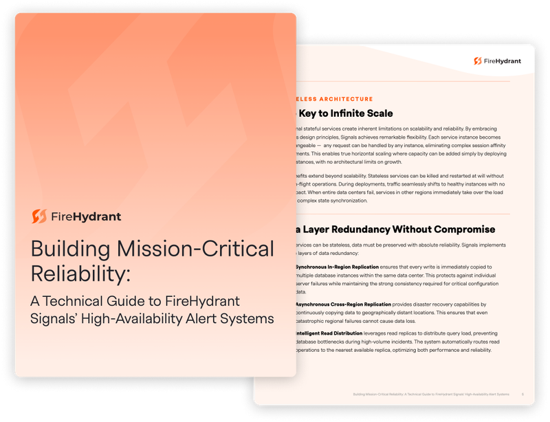 Discover how FireHydrant Signals turns alerting into a mission-critical reliability layer, delivering 99.99% uptime, scalability, and transparency through every architectural decision.